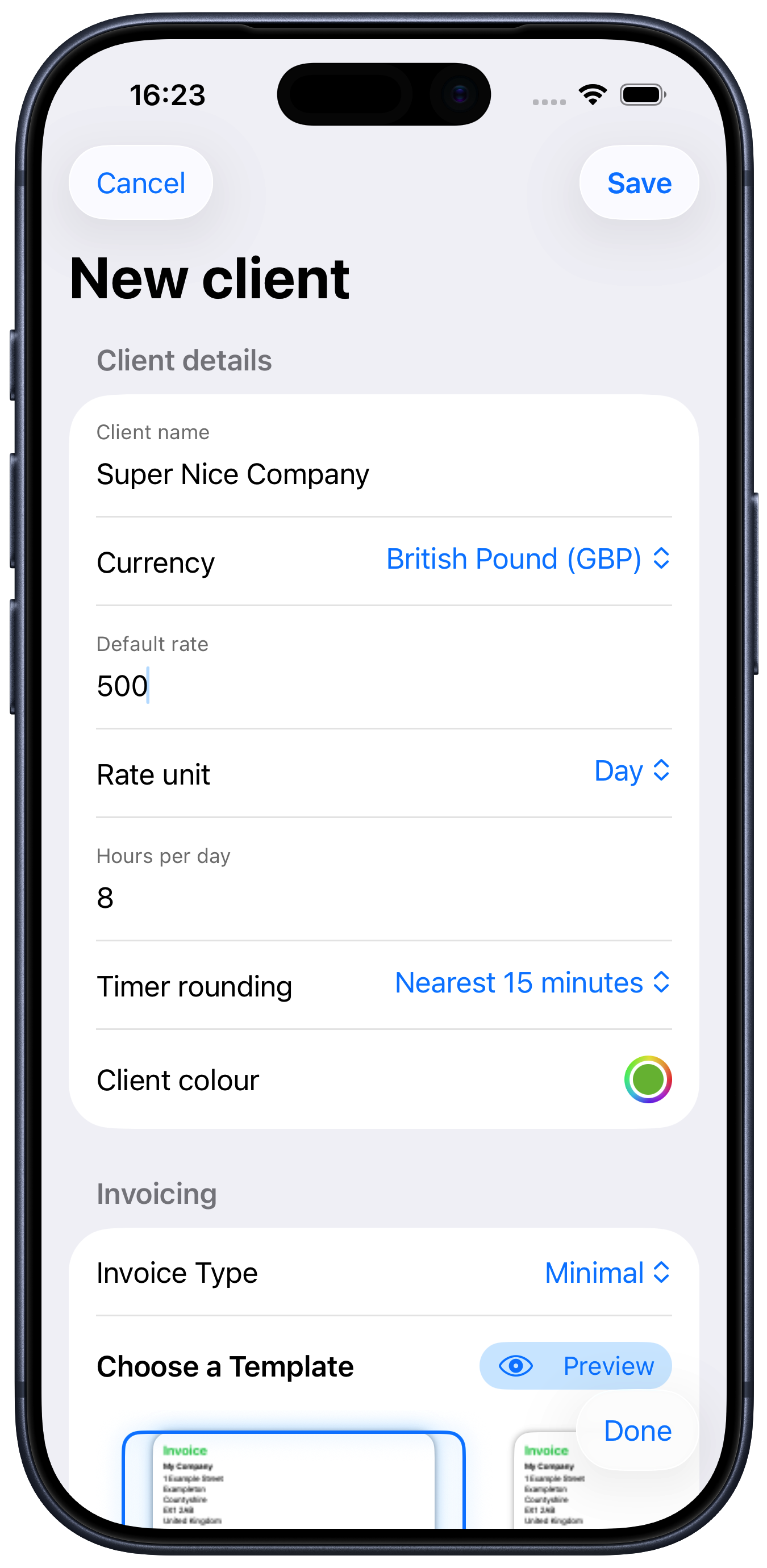 Invoice Type: you can choose from one of the pre-defined templates here. The thumbnail view will highlight the one you have selected. Tap the “Preview” button to see a bigger version on screen. You can also choose a colour for the highlights in the invoice.
