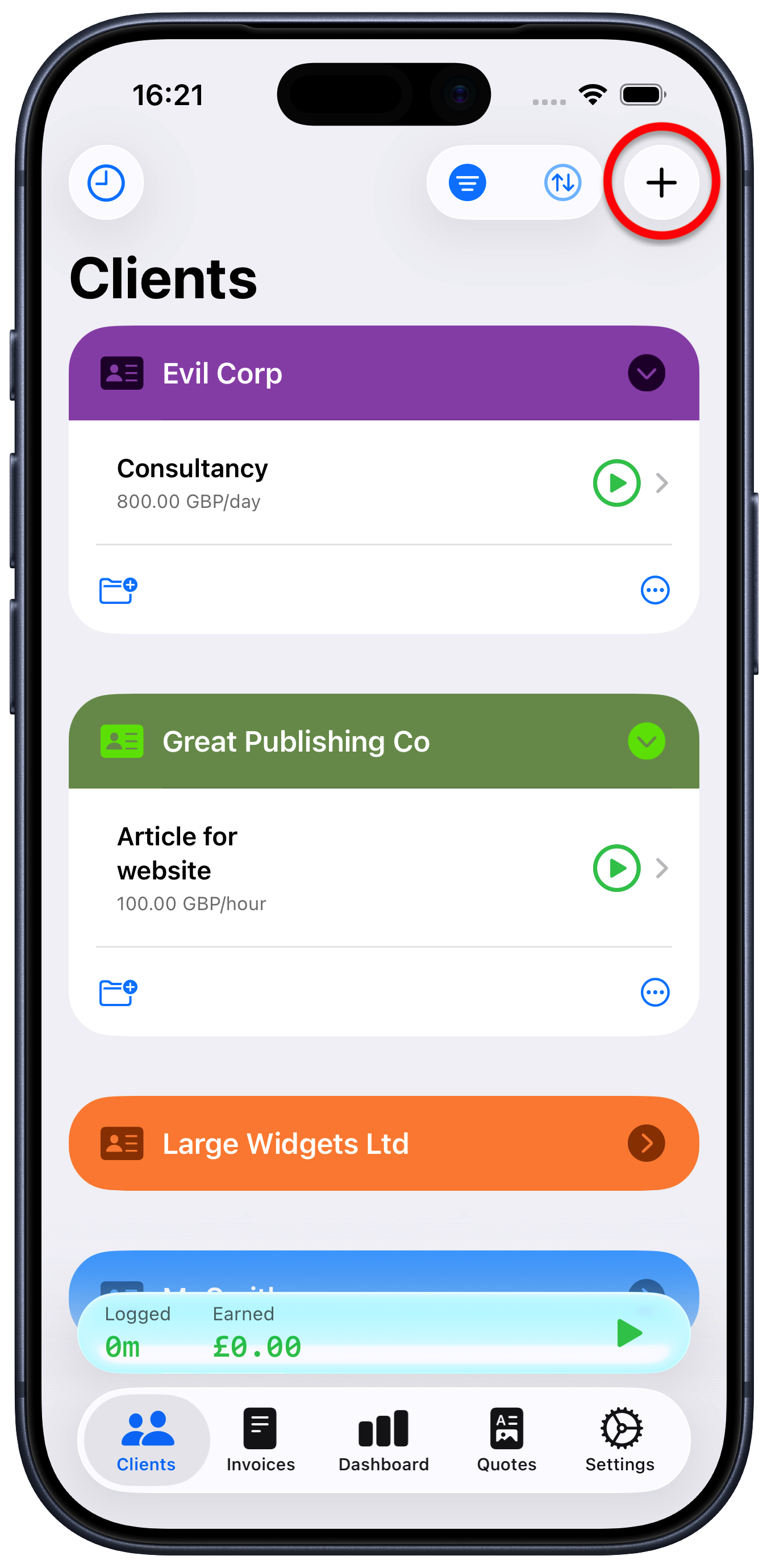 Tap the “+” button at the top right of the Clients tab