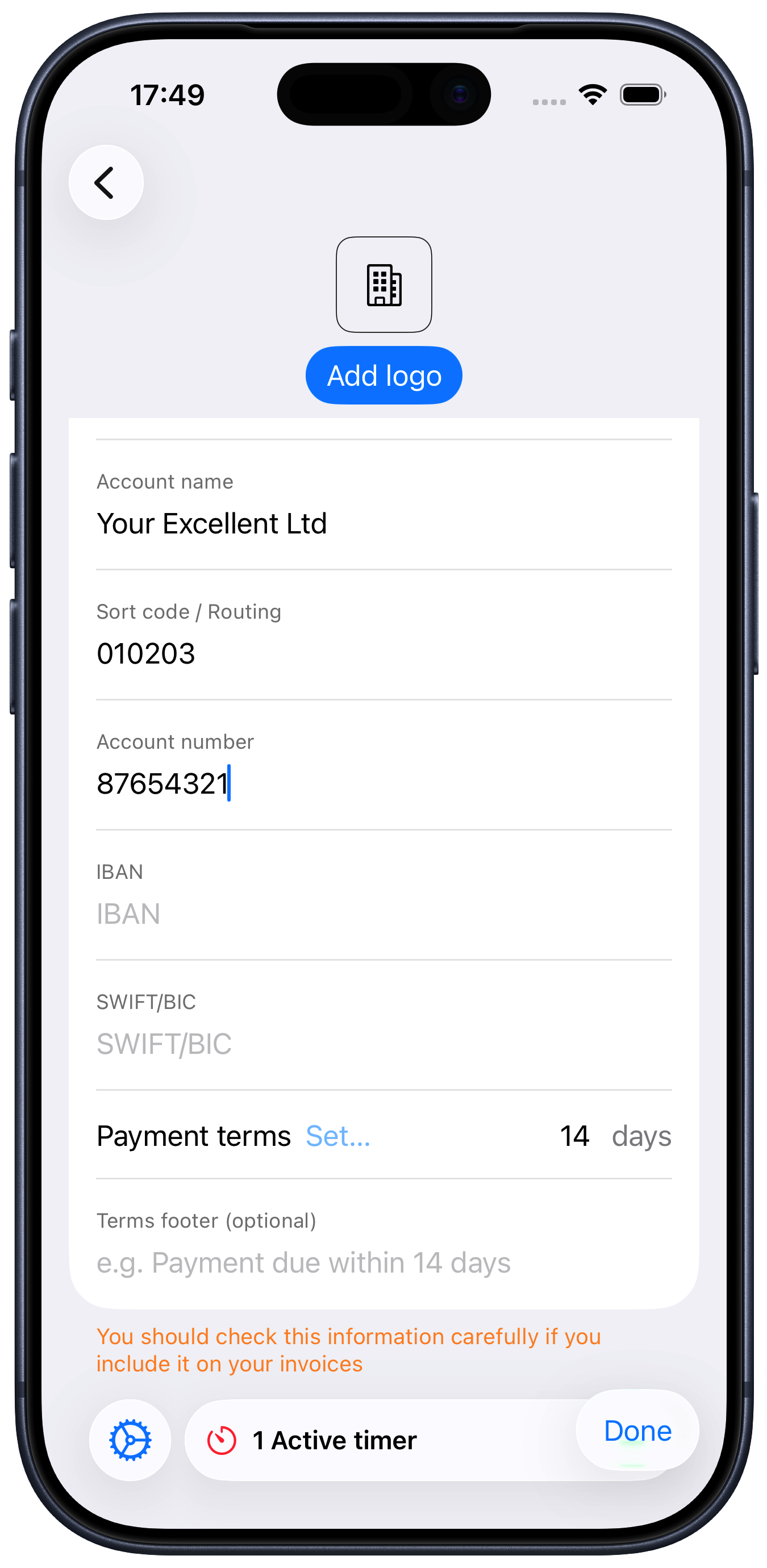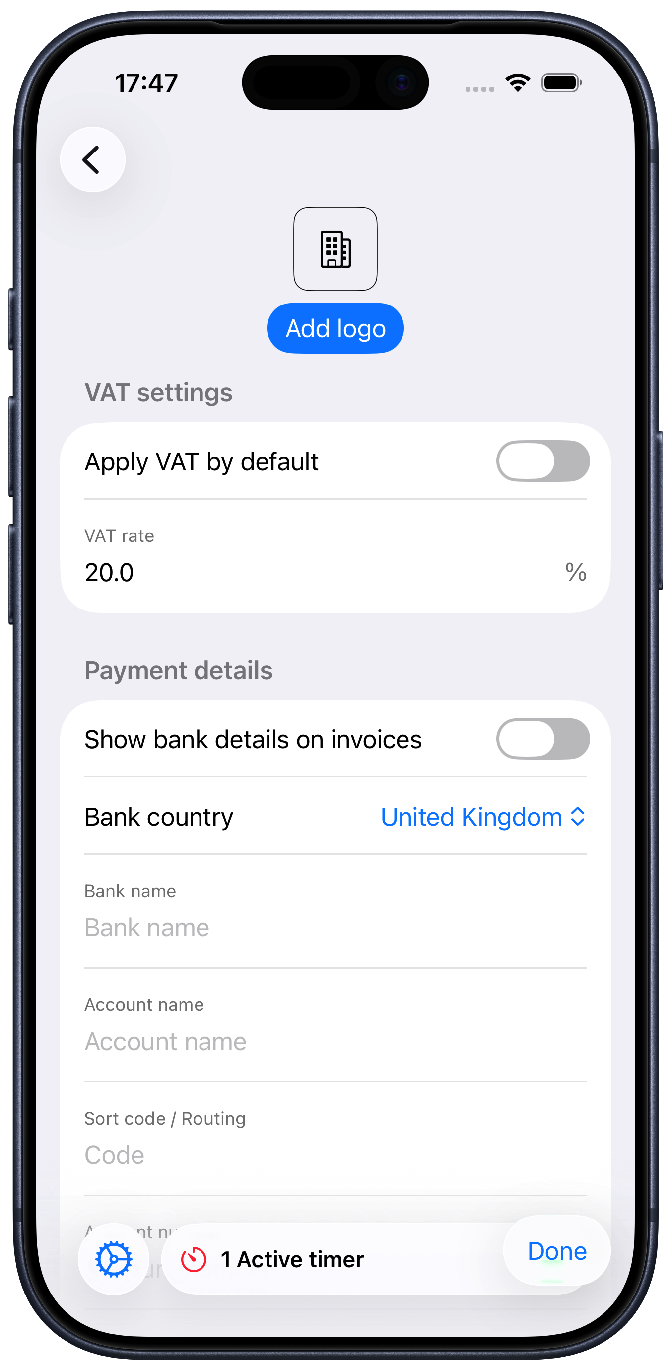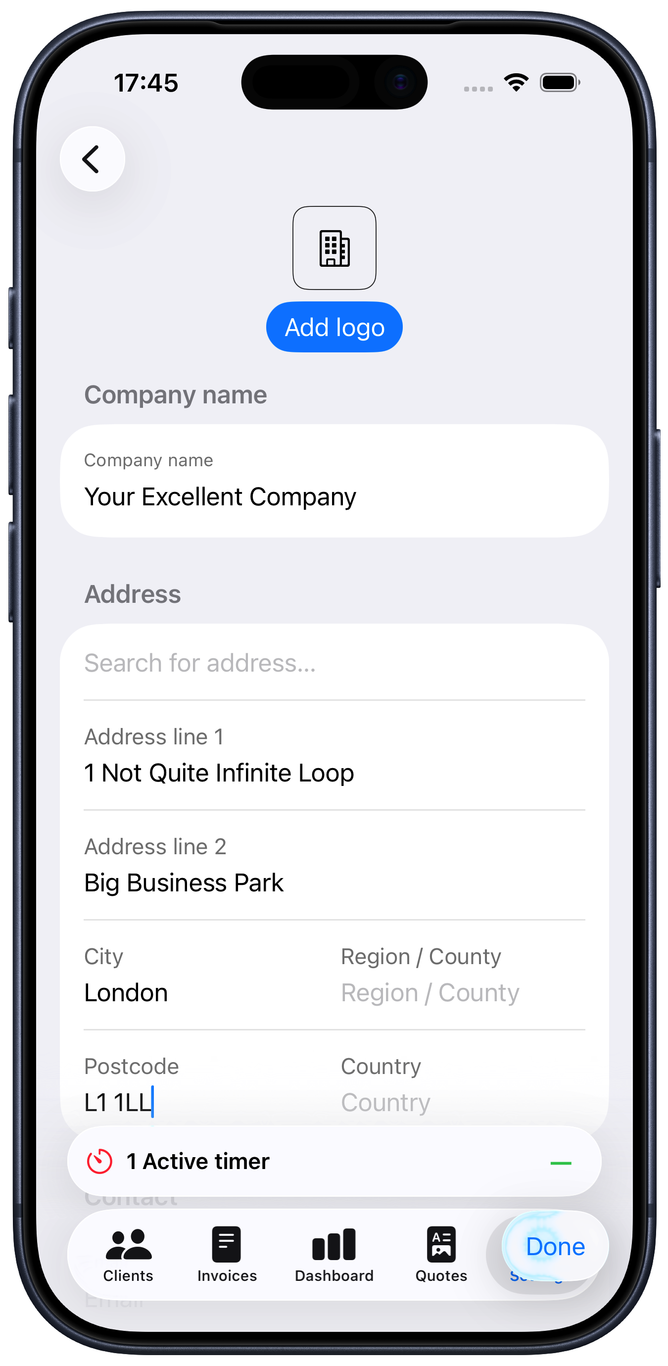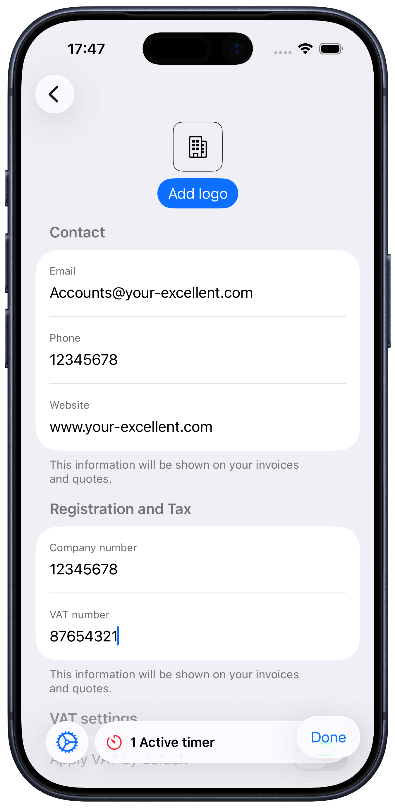 Company logo: You can add your own company logo to invoices and quotes. Just tap on the “Add logo” button then choose the image you want to use.