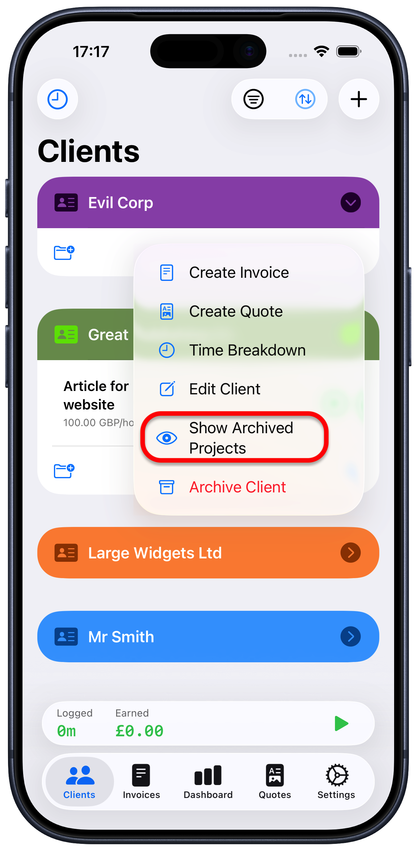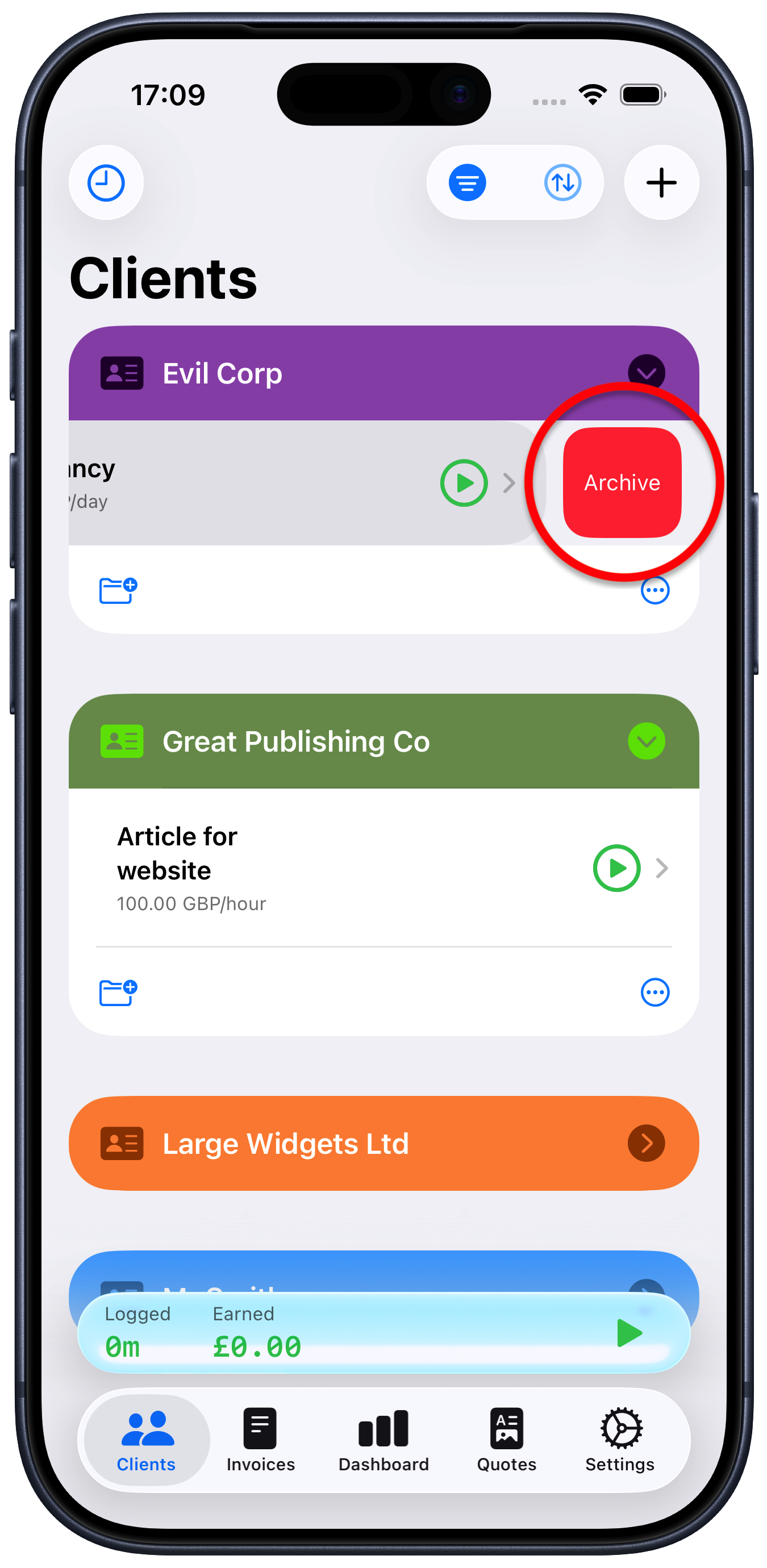 Archiving a project “hides” that project from the list of projects associated with the client. Although a project might be finished and you’ve invoiced and been paid, you might still want to log time against it in the future, for example, if something needs fixing under warranty (or you may just want to set up a separate project for that).