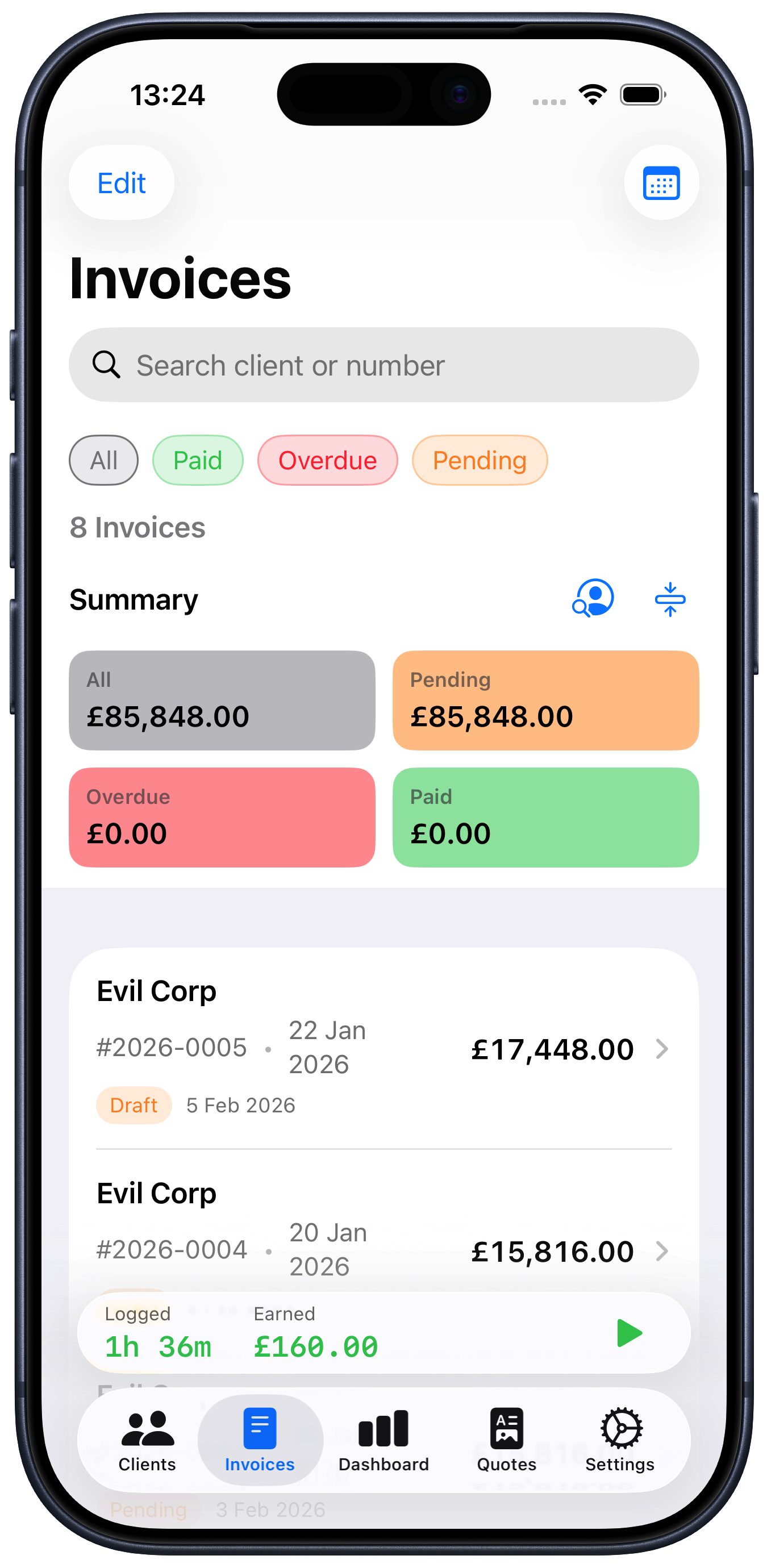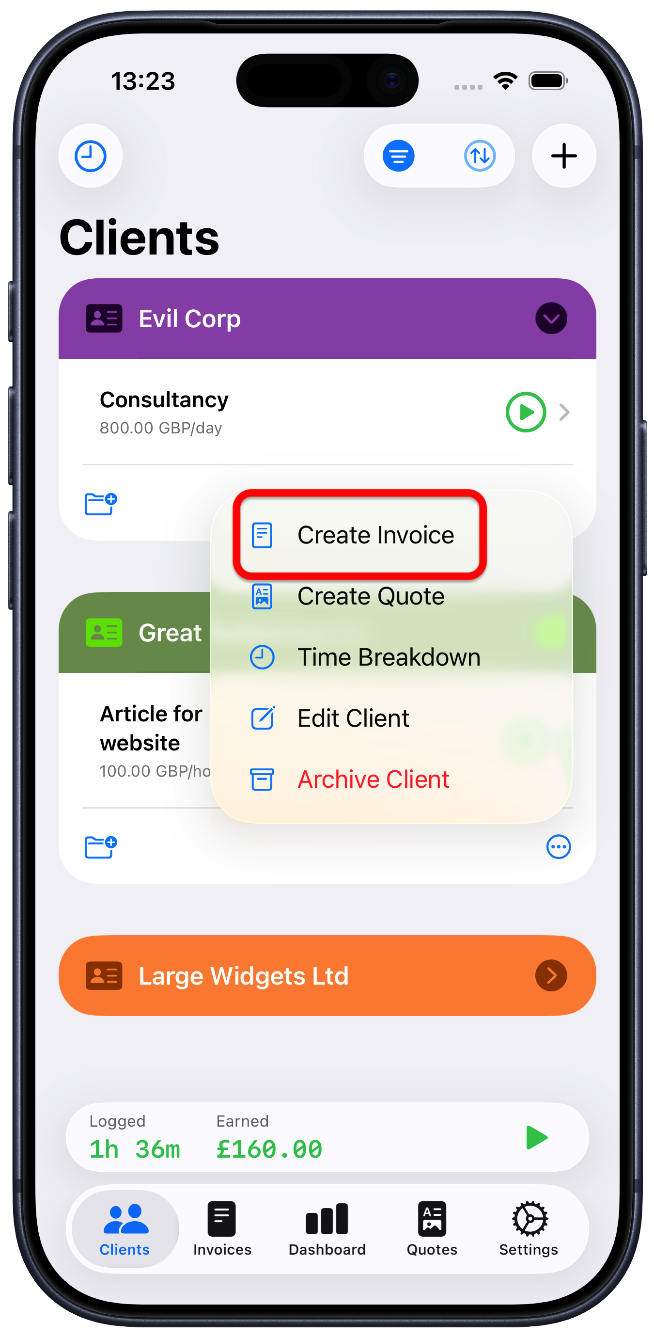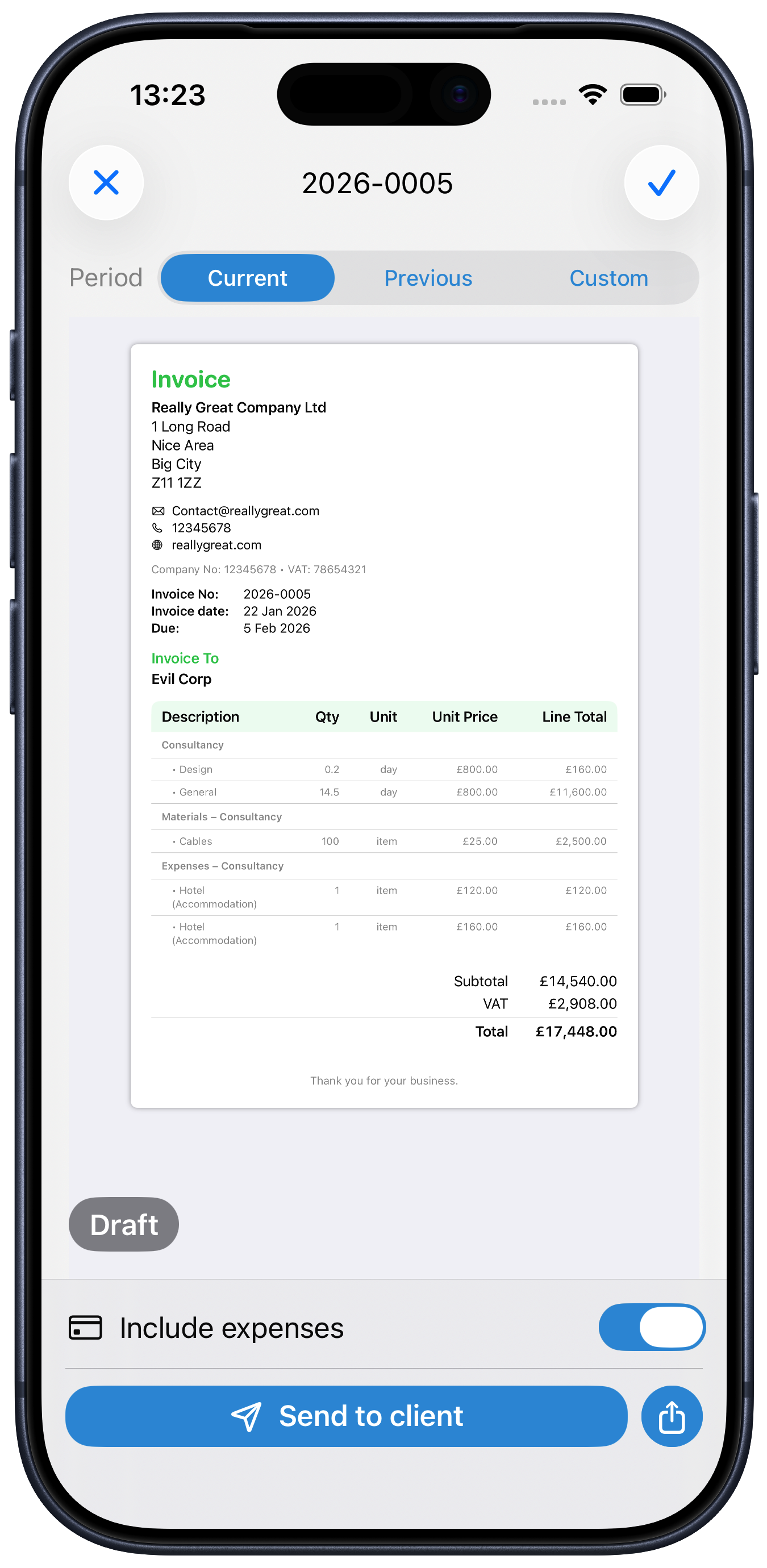 You will then get a preview of the invoice. Check it over and make sure it is as expected, then you can email it straight to the client by tapping the “Send to client” button.