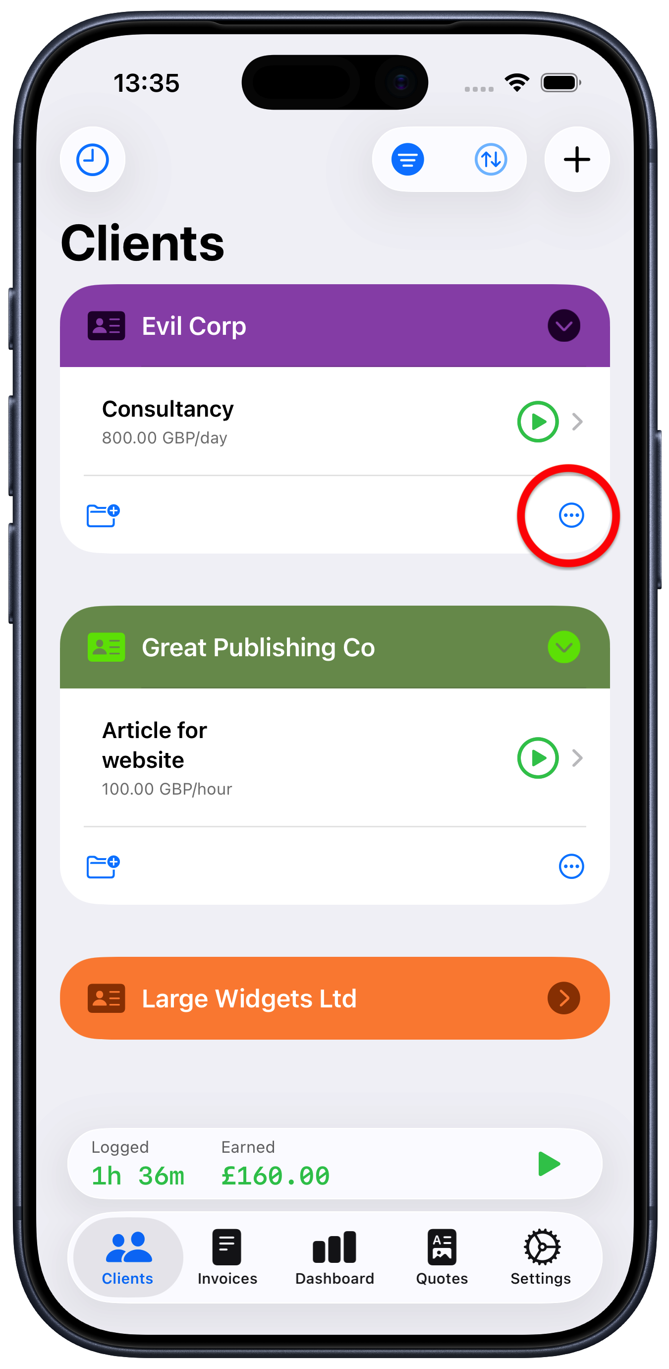 Next to client you want to create the invoice for, tap the ellipsis “…” button