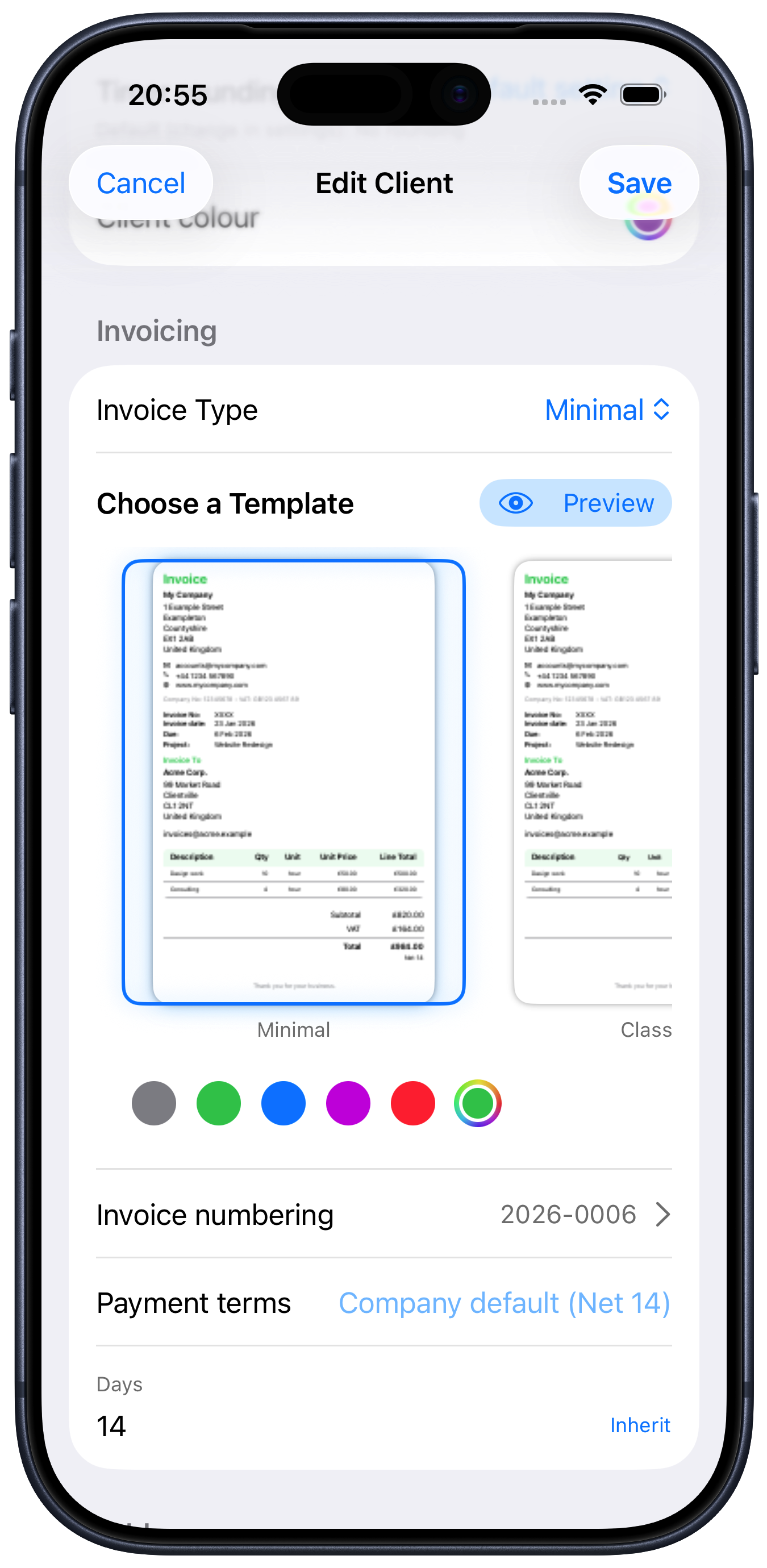 Now when you create an invoice for this client, Solotime will use the template you chose.